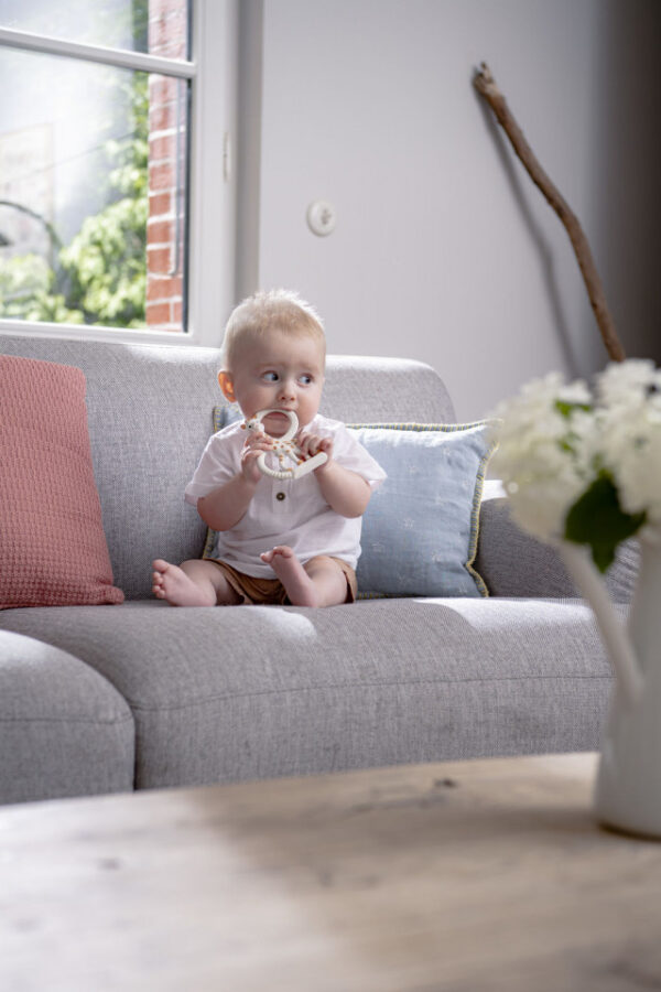 Inel dentitie girafa Sophie fabricat din cauciuc natural, non-toxic, fin, moale, excelent pentru calmarea durerilor cauzate de aparitia primilor dintisori. Un inel de dentitie sigur si natural cu o multime de parti masticabile: urechile, picioarele, inelele etc.