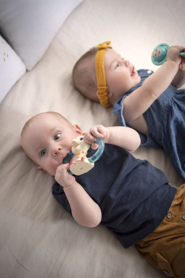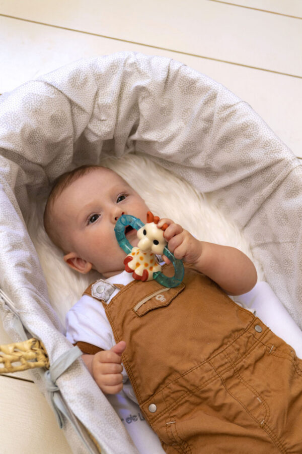 Acest inel refrigerant calmeaza durerile gingiilor inflamate. Ambele laturi au texturi diferite pentru masarea usoara a gingiilor. Inelele pot si folosite si ca manere in timp ce bebelusul rontaie urechile sau coarnele girafei.