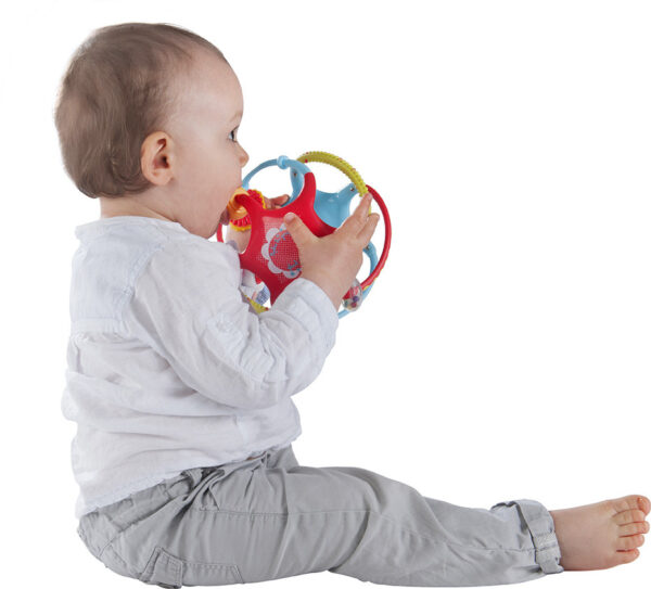 Este foarte usoara ca greutate si simplu de tinut in mainile bebelusului. Cand mingea este scuturata, bebelusul va auzi bilutele zornaind. De asemenea, se va amuza plimband inelele patrate si colorate de-alungul tijelor care contureaza mingea. Mingea este viu colorata, cu texturi si materiale diferite, pentru a dezvolta vazul si simtul tactil ale bebelusului. Pe langa cele 2 inele soft, mingea are 2 tije din material moale, perfecte pentru ros, calmand durerile gingivale.