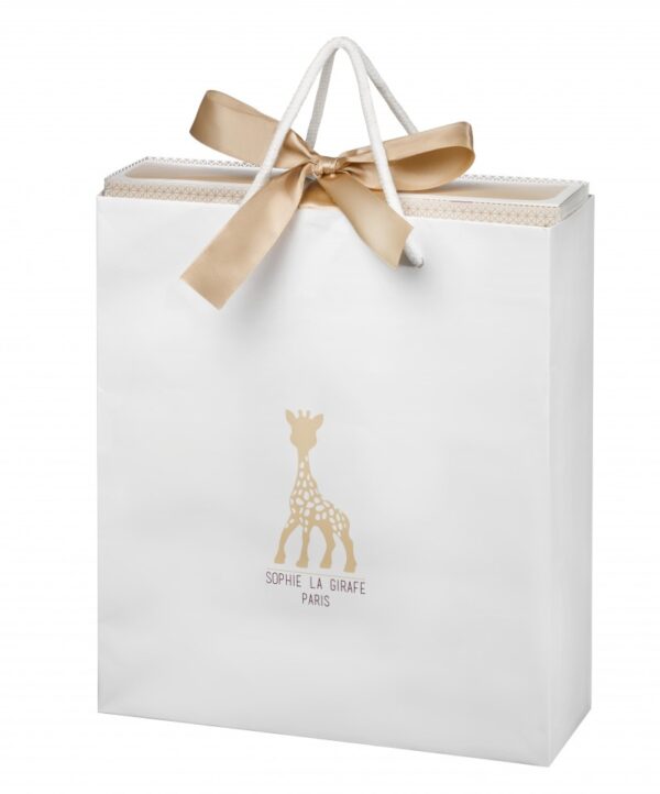 In cutia setului se afla o punga de cadouri si o felicitare alaturi de girafa Sophie si o jucarie zornaitoare.